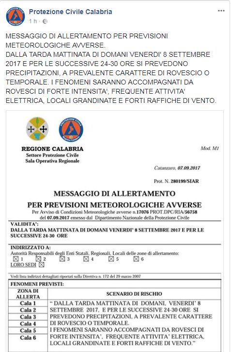 Il bollettino diffuso poco fa dalla Protezione Civile Calabria:
