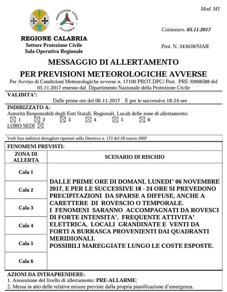 Il bollettino diramato poco fa dalla Protezione Civile Calabria: