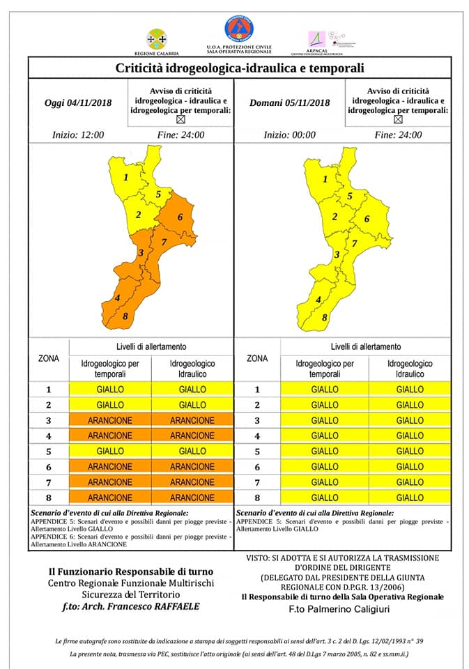 I bollettini diffusi oggi in giornata dalla Protezione Civile Calabria: