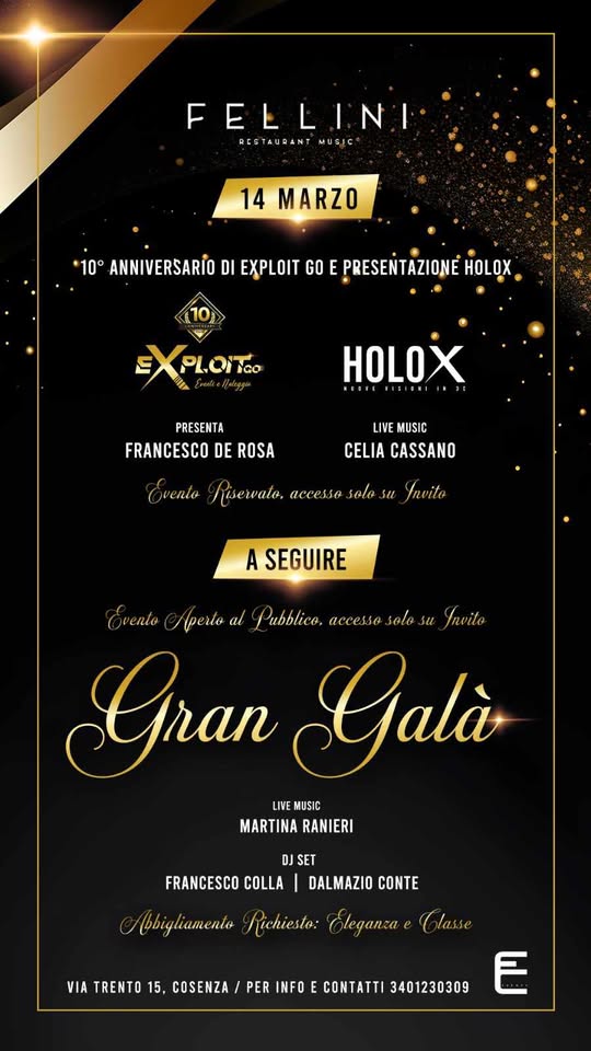 Dopo la presentazione di HoloX, la serata proseguirà con un Gran Galà per celebrare i 10 anni di successi di Exploit Go, l’agenzia che ha rivoluzionato l’organizzazione di eventi. Un appuntamento all’insegna dell’eleganza, con live music, DJ set e un’atmosfera unica per brindare insieme al futuro!”