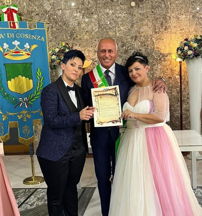 “La felicità che si legge nel viso delle spose ed in quello dei loro familiari ed amici – ha concluso il sindaco Franz Caruso – mi riempie di gioia. Nel formulare i miei più sentiti auguri a Raffaella ed a Eugenia, che ringrazio per averci reso parte di questo bellissimo momento, auspico per la mia Cosenza di proseguire nel cammino della difesa dei diritti e della libertà, affinchè sia sempre pronta ad arginare pregiudizi ed ostilità di ogni genere”.