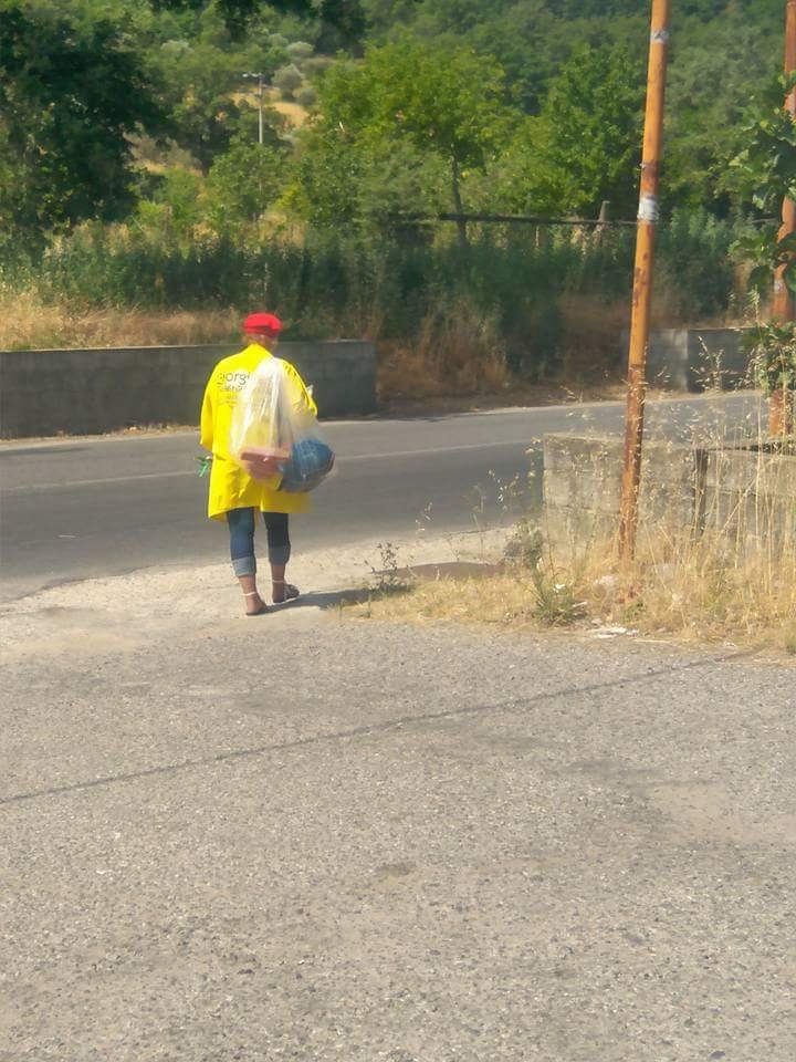 Si vede in giro vestita sia di giallo che di rosso, e se le rivolgi la parola è maleducata e minaccia di picchiarti. Sicuramente è una signora che ha bisogno di aiuto …ma sta facendo danni ed in molti si spaventano.