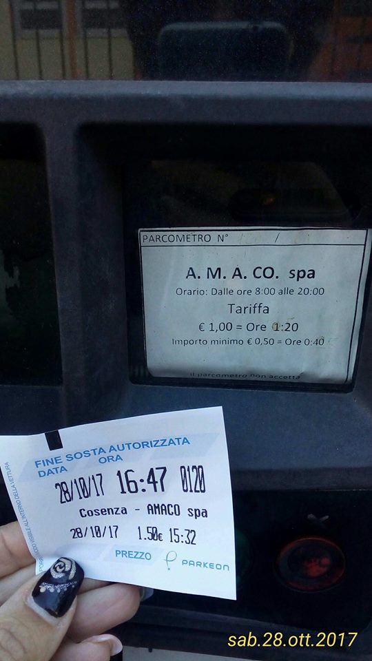 Ho parcheggiato sabato, 28 ottobre, a Cosenza su via Rodotà… pagando regolarmente il biglietto.