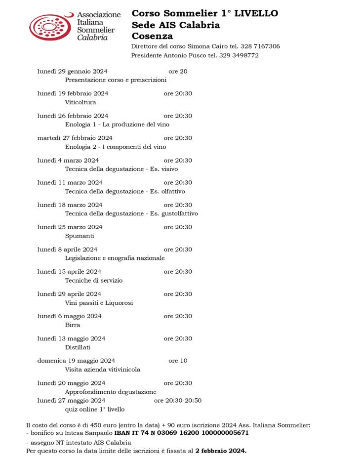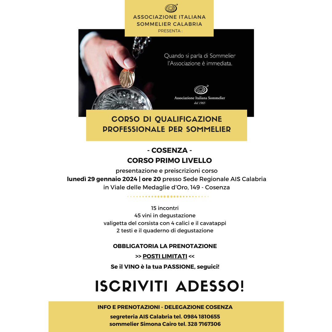 Nuovo corso di 1° livello in partenza a Cosenza, presso la sede regionale “Associazione Italiana Sommelier Calabria”, in Viale delle Medaglie d’Oro, 149 – Qui tutte le informazioni
