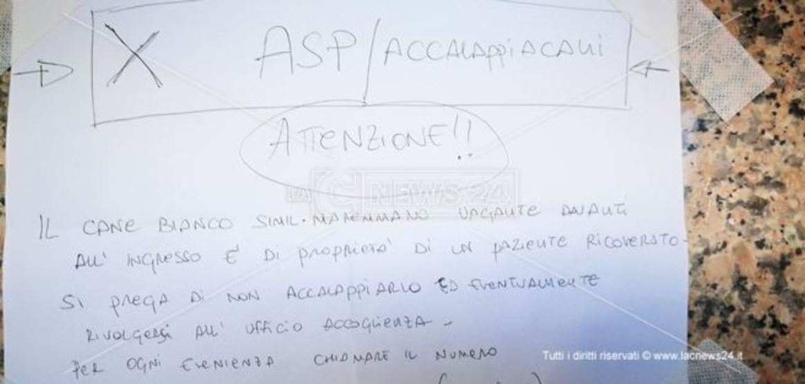 “Da ieri attende alla porta d’ingresso il suo amico umano ricoverato all’ospedale Pugliese Ciaccio di Catanzaro. Si tratta di un cane di grossa taglia, bianco e con le orecchie caffellatte, che ha conquistato in poco tempo l’amore dei passanti e dei dipendenti della struttura sanitaria. Lo hanno accolto al corpo di guardia, dove lo sfamano e gli tengono compagnia in attesa che il suo amico umano sia dimesso.”