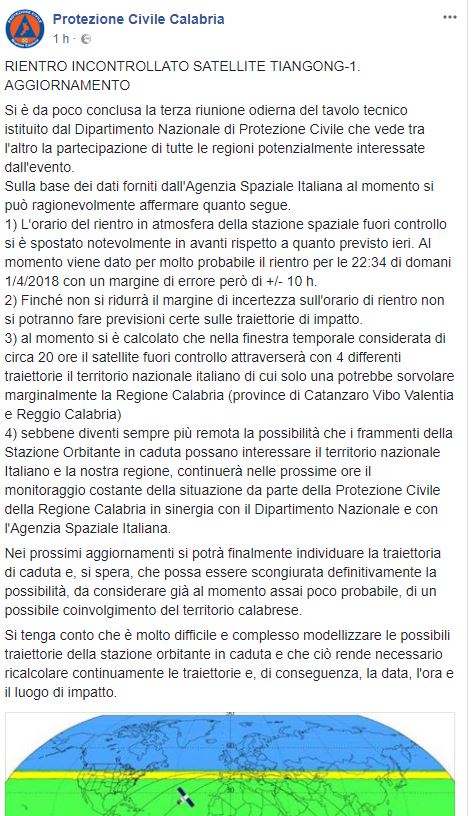 4) sebbene diventi sempre più remota la possibilità che i frammenti della Stazione Orbitante in caduta possano interessare il territorio nazionale Italiano e la nostra regione, continuerà nelle prossime ore il monitoraggio costante della situazione da parte della Protezione Civile della Regione Calabria in sinergia con il Dipartimento Nazionale e con l’Agenzia Spaziale Italiana.