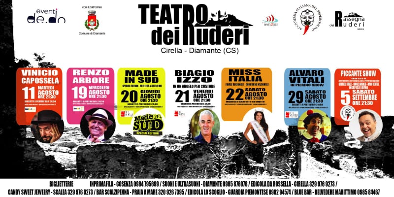 La stagione dei Ruderi inizierà l’11 agosto con Vinicio Capossela, evento organizzato da Ruggero Pegna, in uno spettacolo inedito intitolato “Pandemonium”, a seguire il 19 agosto sarà il turno di Renzo Arbore insieme all’Orchestra Italiana. Il 20 agostoparte la prima edizione della Rassegna dei Ruderi,organizzata dalla Dedo Eventi di Alfredo De Luca, con lo spettacolo dei record, Made in Sud in una edizione Speciale con i comici di punta del programma ossia Arteteca e Ditelo Voi.