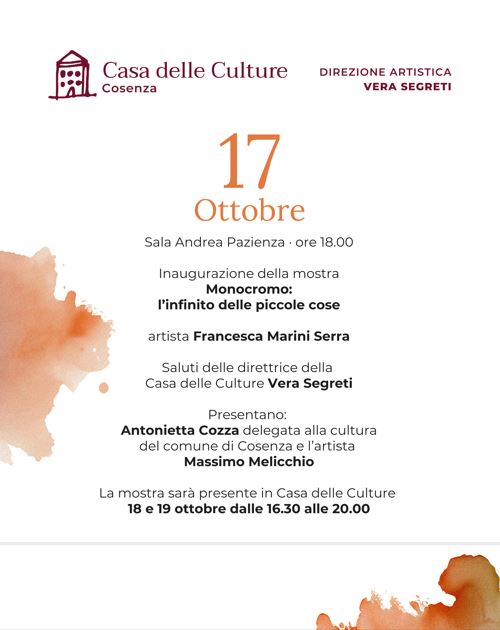Il primo appuntamento della nuova stagione culturale è fissato per venerdì 17 ottobre, alle ore 18:00, nella Sala Andrea Pazienza, con l’inaugurazione della mostra dal titolo: “Monocromo: l’infinito delle piccole cose”, dell’artista Francesca Marini Serra