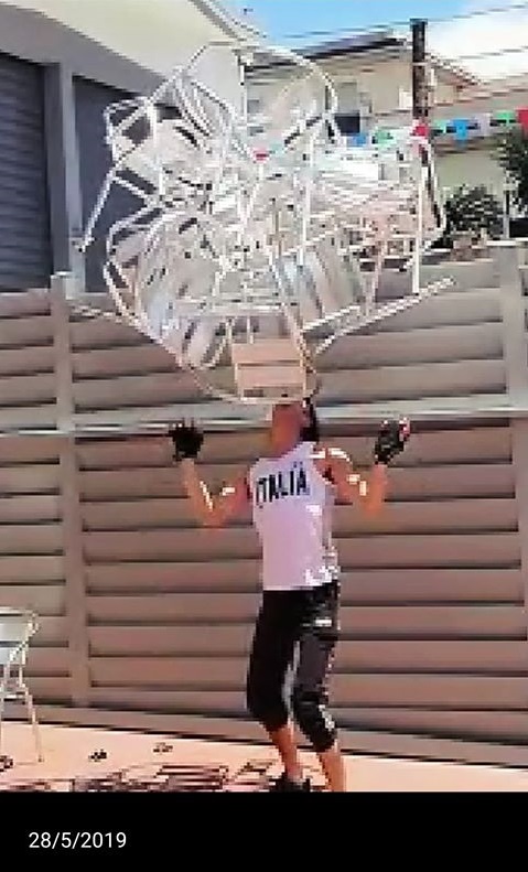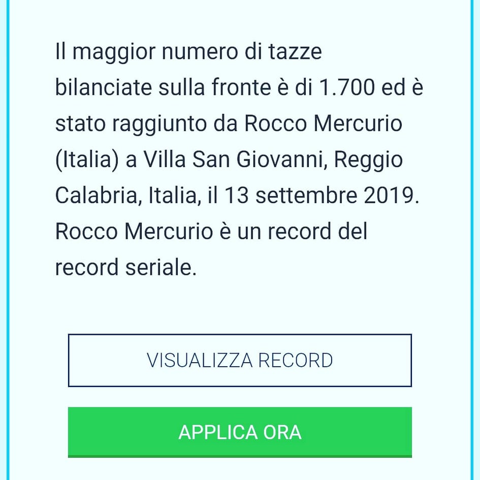 – Il record delle tazze consiste nel contare ad una ad una e posizionare una dentro l’altra, e poi mettere tutta la fila sulla fronte ed equilibrarla per almeno 10 secondi (1700)