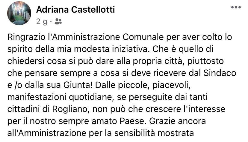 “L’Amministrazione comunale esprime tutto il suo apprezzamento per la bella iniziativa promossa dalla signora Adriana Castellotti, nostra concittadina che vive a Cosenza e che tiene vivo il ricordo del proprio Paese di origine partecipando con azioni di “cittadinanza attiva” a renderlo più bello e ad averne cura.