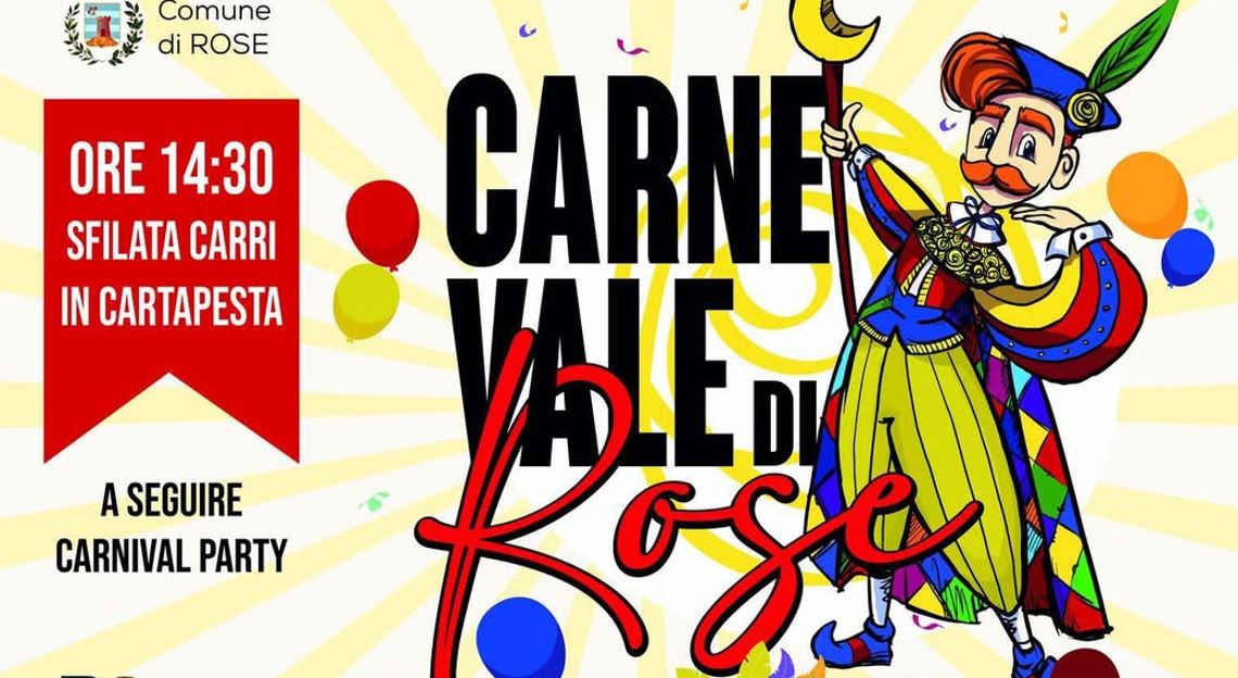 A partire dalle ore 14:30, la tradizionale sfilata di carri allegorici e gruppi mascherati darà ufficialmente il via alla festa. Il corteo partirà da Via Rocco Docimo (davanti alle scuole medie di Rose) e attraverserà il paese fino a raggiungere Piazza Gaetano Argento, dove il divertimento continuerà con il Carnival Party.