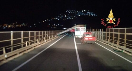 Un autoarticolato telonato, scoperchiato causa forti raffiche di vento, ha bloccato in entrambi i sensi di marcia la SS18.