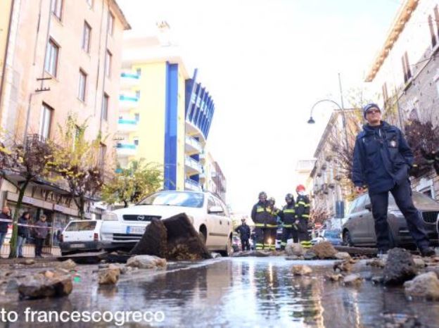 “Paura in centro, per l’esplosione di una condotta idrica. Sul posto sono intervenute le forze dell’ordine e i vigili del fuoco che hanno subito bloccatosi traffico e transennato la zona per metterla in sicurezza. Al momento dello scoppio stava transitando un’auto che ha attutito “il colpo”.”