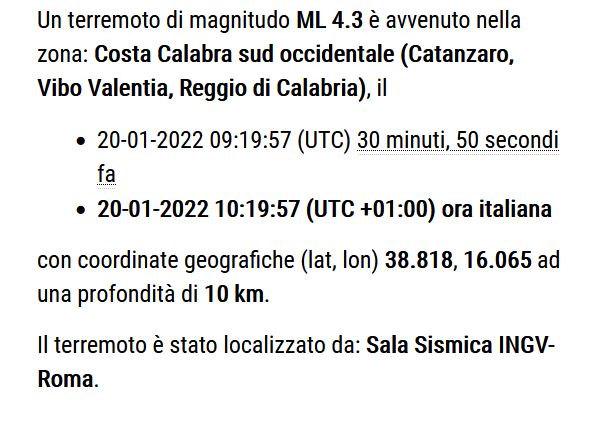 “Un terremoto di magnitudo ML 4.3 è avvenuto nella zona, alle h 10.19. La scossa è stata localizzata nella Costa Calabra sud occidentale (Catanzaro, Vibo Valentia, Reggio di Calabria), ad una profondità di 10km.