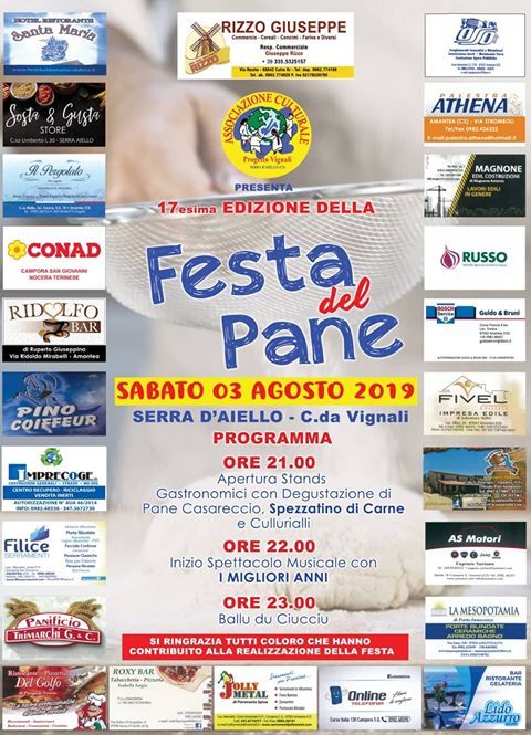 Sabato 03 agosto 2019 l’Associazione Culturale ” Progetto Vignali ” organizzerà la 17esima edizione della ” FESTA DEL PANE “