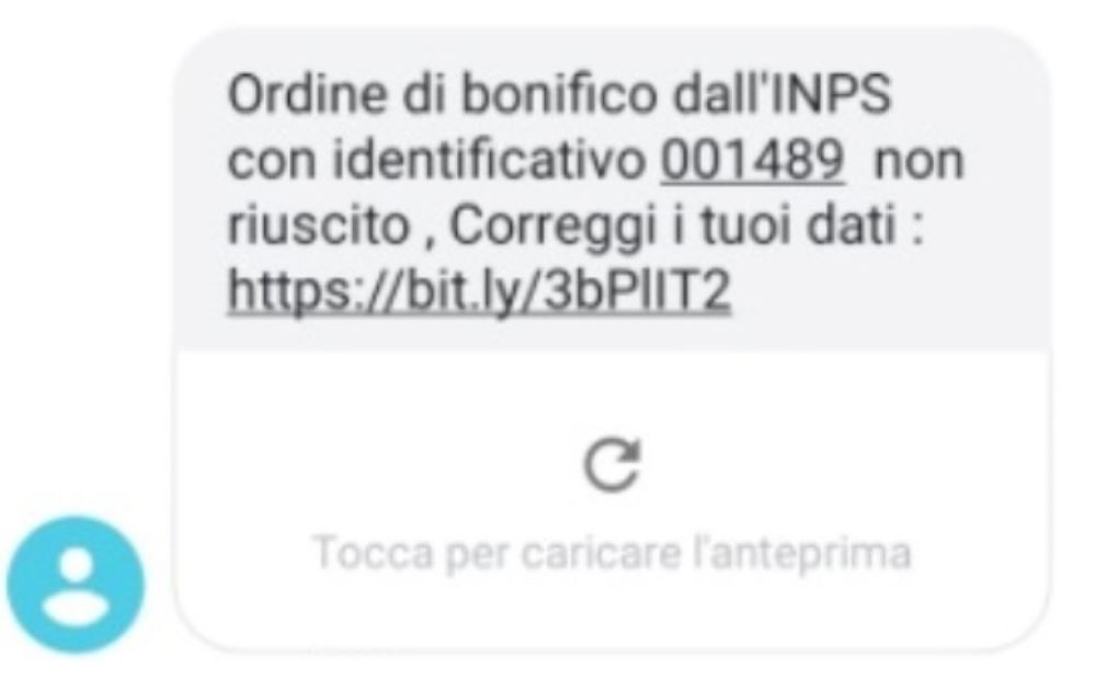 I truffatori inviano un sms con l’avviso che è stato effettuato un bonifico da parte dell’I.N.P.S invitando a cliccare su un link.