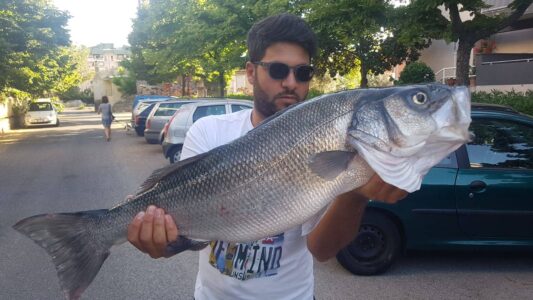 Genesio è appassionato di pesca da quando era bambino. Oggi ha avuto la bravura di pescare questa spigola di mare da 7kg con la tecnica “bolognese con bigattino”.