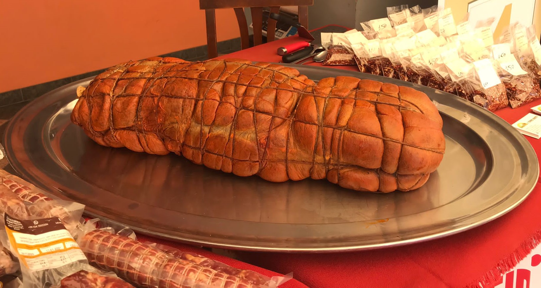 La nduja, il salume calabrese piccante spalmabile più famoso della Calabria, dal gusto unico e deciso, è stato prodotto per l’occasione dall’azienda Solmeu di Polistena (RC).