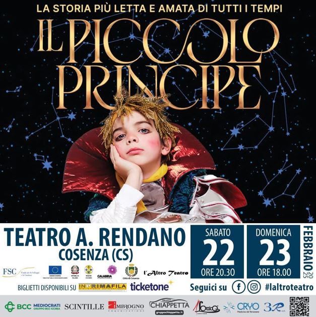 La storia più letta e amata di tutti i tempi, “Il Piccolo Principe” capolavoro di Antoine de Saint-Exupéry, diventa un musical dalle mille sfumature, diretto da Stefano Genovese, e andrà in scena al Teatro Alfonso Rendano di Cosenza sabato 22 febbraio, ore 20.30, e domenica 23 febbraio, ore 18.00, nell’ambito della “Rassegna L’Altro Teatro”, curata da Gianluigi Fabiano e Giuseppe Citrigno