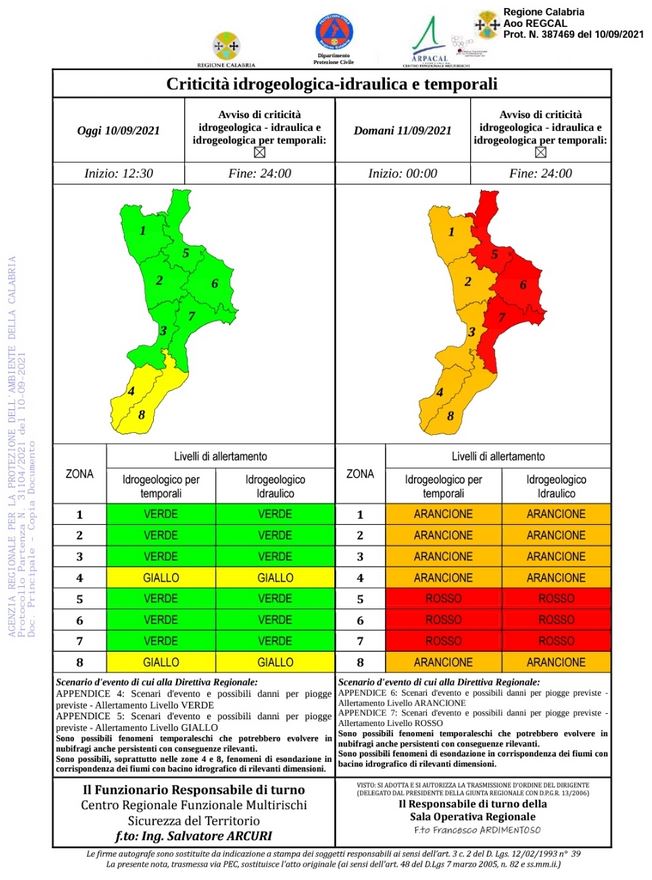 Per domani, sabato 11 settembre, la Protezione Civile ha diramato l’allerta meteo rossa per criticità idrogeologica-idraulica sulla costa ionica settentrionale della Calabria e allerta arancione nel resto della regione.