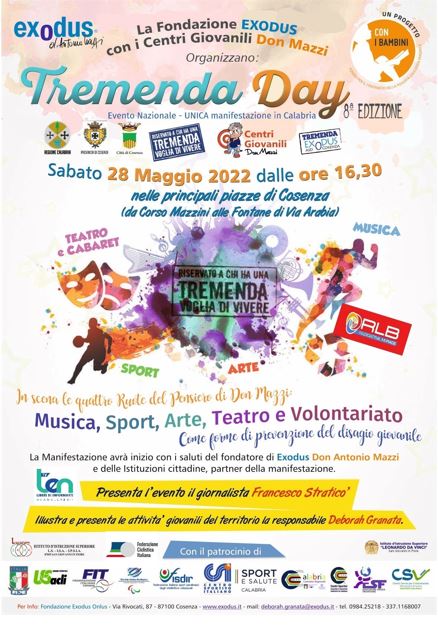 Il 28 maggio 2022, dalle ore 16.30, si svolgerà a Cosenza l’ottava edizione della manifestazione “Tremenda Day”, organizzata dalla Fondazione Exodus con i Centri Giovanili Don Mazzi, in partenariato con il Comune di Cosenza