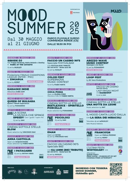 Il Mood Summer 2025 torna a Rende (CS), dal 30 maggio al 21 giugno, per una nuova edizione che trasforma il Parco Fluviale in uno spazio aperto e dinamico, dedicato alla cultura, alla musica e all’intrattenimento