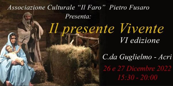 Torna anche quest’anno l’appuntamento con il tradizionale “Presepe Vivente” giunto alla sua sesta edizione, organizzato dall’associazione Culturale “Il Faro” Pietro Fusaro, che sarà possibile visitare nei giorni 26 e 27 dicembre 2022 presso la c.da Guglielmo di Acri.