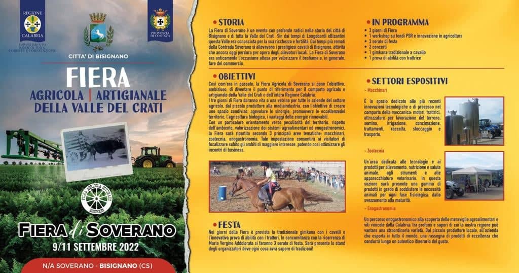 Così com’era in passato, la Fiera Agricola di Soverano si pone l’obiettivo, ambizioso, di diventare il punto di riferimento per il comparto agricolo e artigianale della Valle del Crati e dell’intera Regione Calabria.