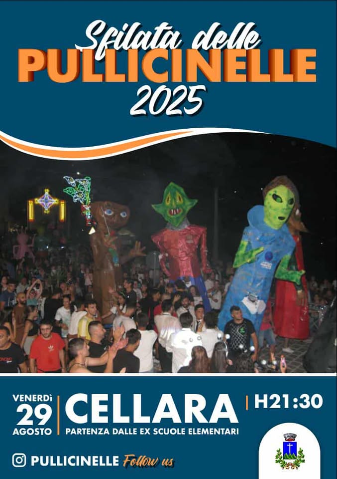 Il fuoco, simbolo di rinnovamento e rigenerazione, diventa così il protagonista di un rito che unisce spiritualità, folklore e comunità. Quest’anno, venerdì 29 agosto, le Pullicinelle torneranno a sfilare e a bruciare. Venite a Cellara a scoprire questa straordinaria tradizione.”