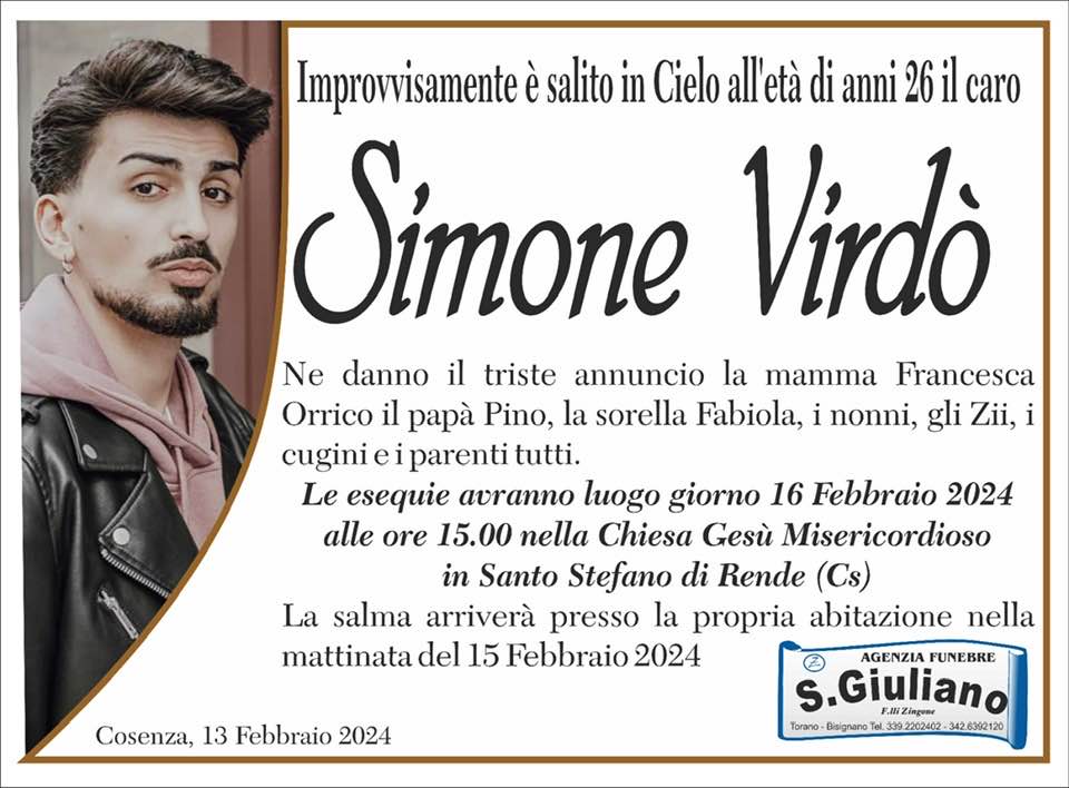 Saranno celebrate questo pomeriggio, 16 febbraio, alle ore 15.00, nella Chiesa Gesù Misericordioso in Santo Stefano di Rende, le esequie di Simone Virdò.