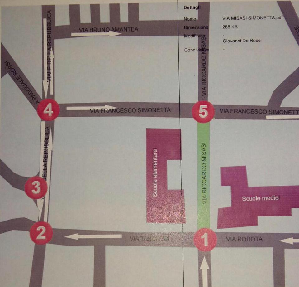 Il divieto di transito sul tratto sopra indicato modificherà i sensi di marcia su alcune strade adiacenti le scuole. In particolare, via Tancredi diventerà percorribile a senso unico da via Misasi verso viale della Repubblica e sul lato destro non sarà possibile parcheggiare (da via Misasi al civicon. 1 e dal n. 26 a Viale della Repubblica), mentre via Simonetta sarà percorribile a senso unico da viale della Repubblica a via Misasi. Doppio senso di marcia su Viale della Repubblica, da via Tancredi a via Simonetta, in modo da consentire a chi volesse andare in direzione nord di riallacciare via Misasi (scendendo per via B. Amantea, dove non si potrà parcheggiare sul lato destro) oppure imboccare via P. Rossi.
