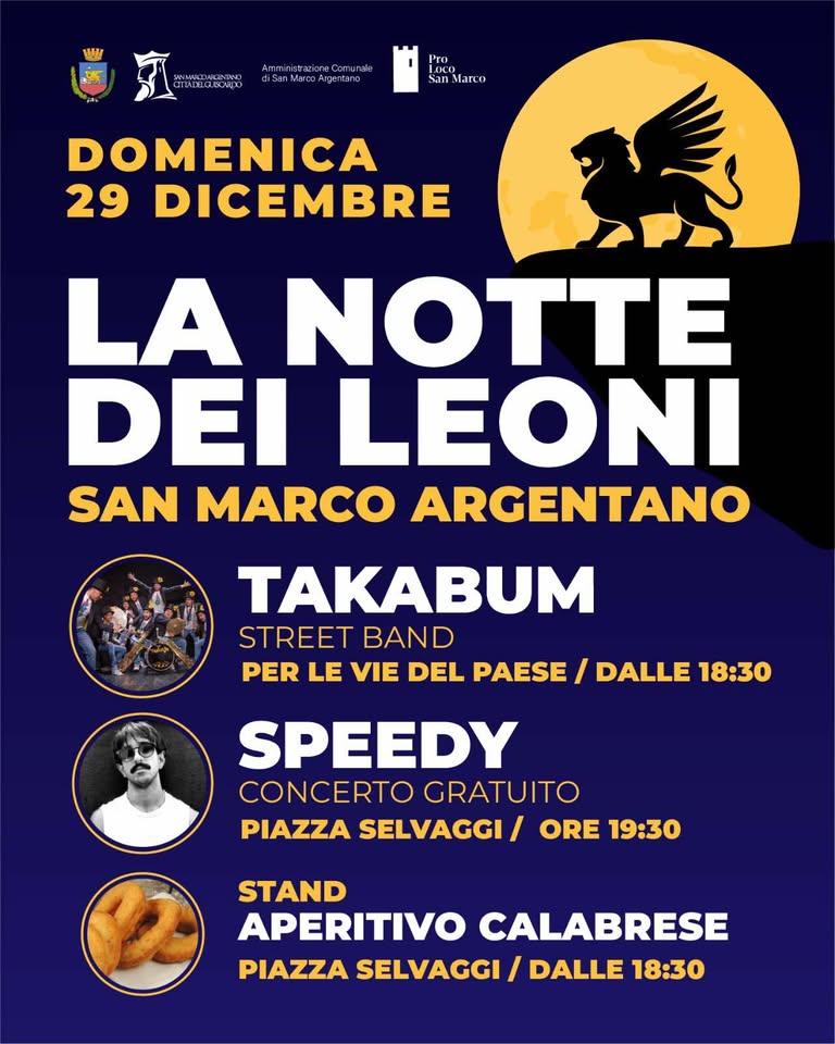 L’Amministrazione Comunale e la Pro Loco San Marco Argentano sono orgogliosi di presentare “La Notte dei Leoni”, una serata all’insegna della musica, dei sapori autentici e della convivialità, per brindare insieme – un po’ in anticipo – al nuovo anno!