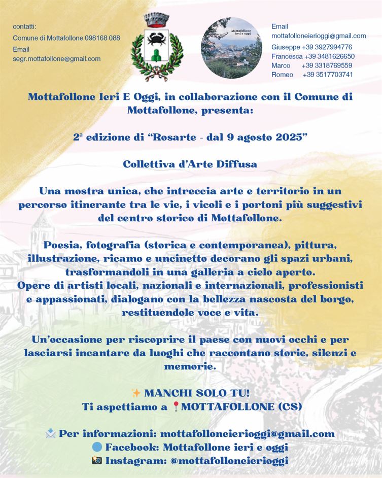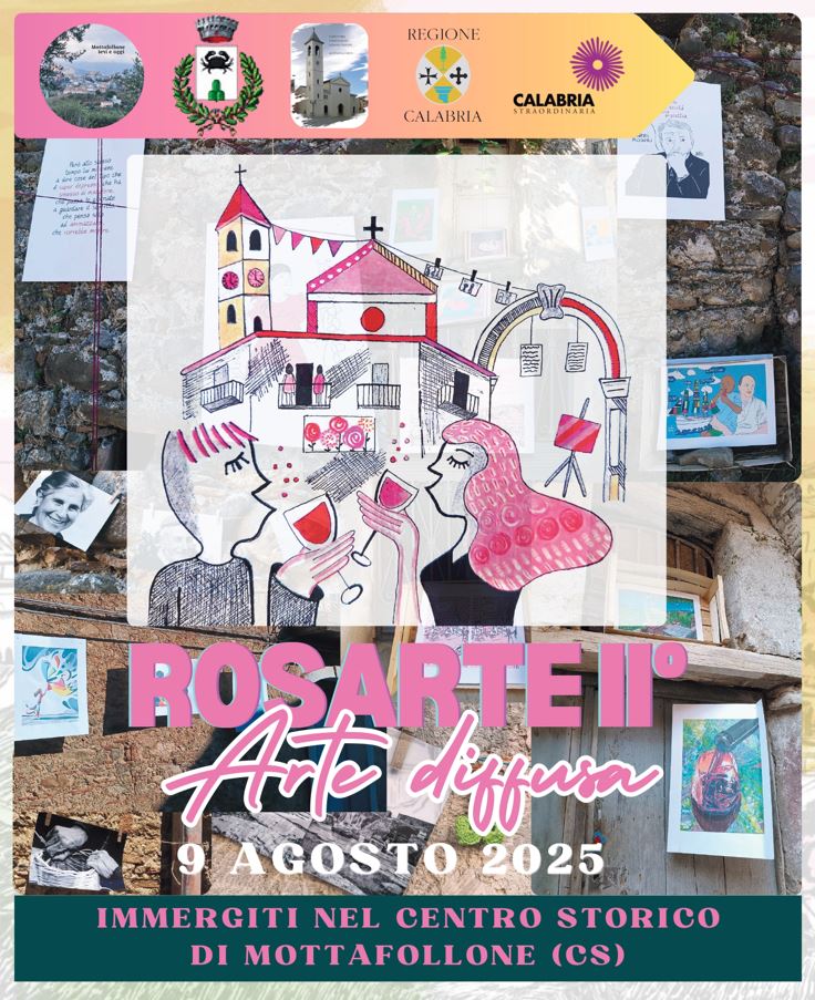“Tra i vicoli antichi del centro storico di Mottafollone (CS) si da il via il 9 agosto alla seconda edizione del Festival Rosarte, collettiva d’ arte diffusa nel borgo medioevale della Valle dell’ Esaro.