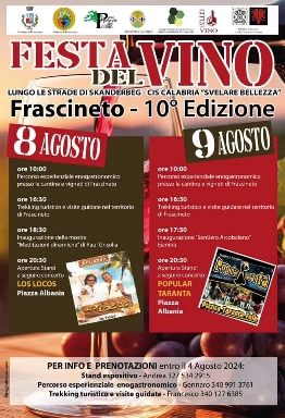 L’8 e 9 agosto, a partire dalle ore 10, si partirà con le celebrazioni della cultura vitivinicola di Frascineto, terra di storia arbëreshë, di religione bizantina, di forte e consapevole identità