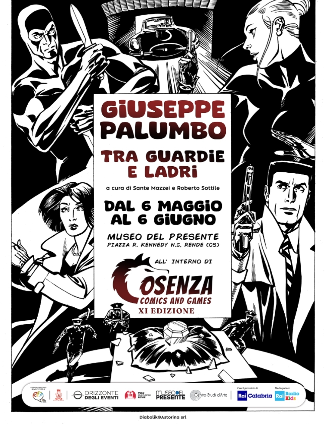 Nel salone principale del museo sarà presente “Tra Guardie e Ladri”, dedicata alla carriera del fumettista Giuseppe Palumbo. Con il patrocinio del Comune di Rende a cura di Sante Mazzei e Roberto Sottile, la mostra ripercorre la pluridecennale attività dell’autore materano: dagli esordi su Frigidaire, con “Ramarro, il primo supereroe masochista”, attraverso la fantascienza di “EternArtemisia” e le narrazioni saggistiche di “Bazar Elettrico” e “Pasolini 1964”, nate in seno al collettivo di ricerca Action30; fino alle biografie di personaggi fuori dagli schemi come Pablo Escobar e Ludovico Nicola di Giura. All’attività d’autore, si affiancano le interpretazioni di grossi personaggi del mainstream a fumetti italiano, a cominciare da Martin Mystère, fino al Tex dello speciale Texone n.40 del 2024 e soprattutto Diabolik, il personaggio che da più lungo tempo è al centro della produzione di Palumbo. Tra guardie e ladri, tra luci e ombre, tra delicate mezzetinte e colori sgargianti, in una scorribanda di oltre 100 tavole originali, l’enorme curiosità per un linguaggio raffinato come quello del fumetto nelle tante fughe di un autore sui generis.