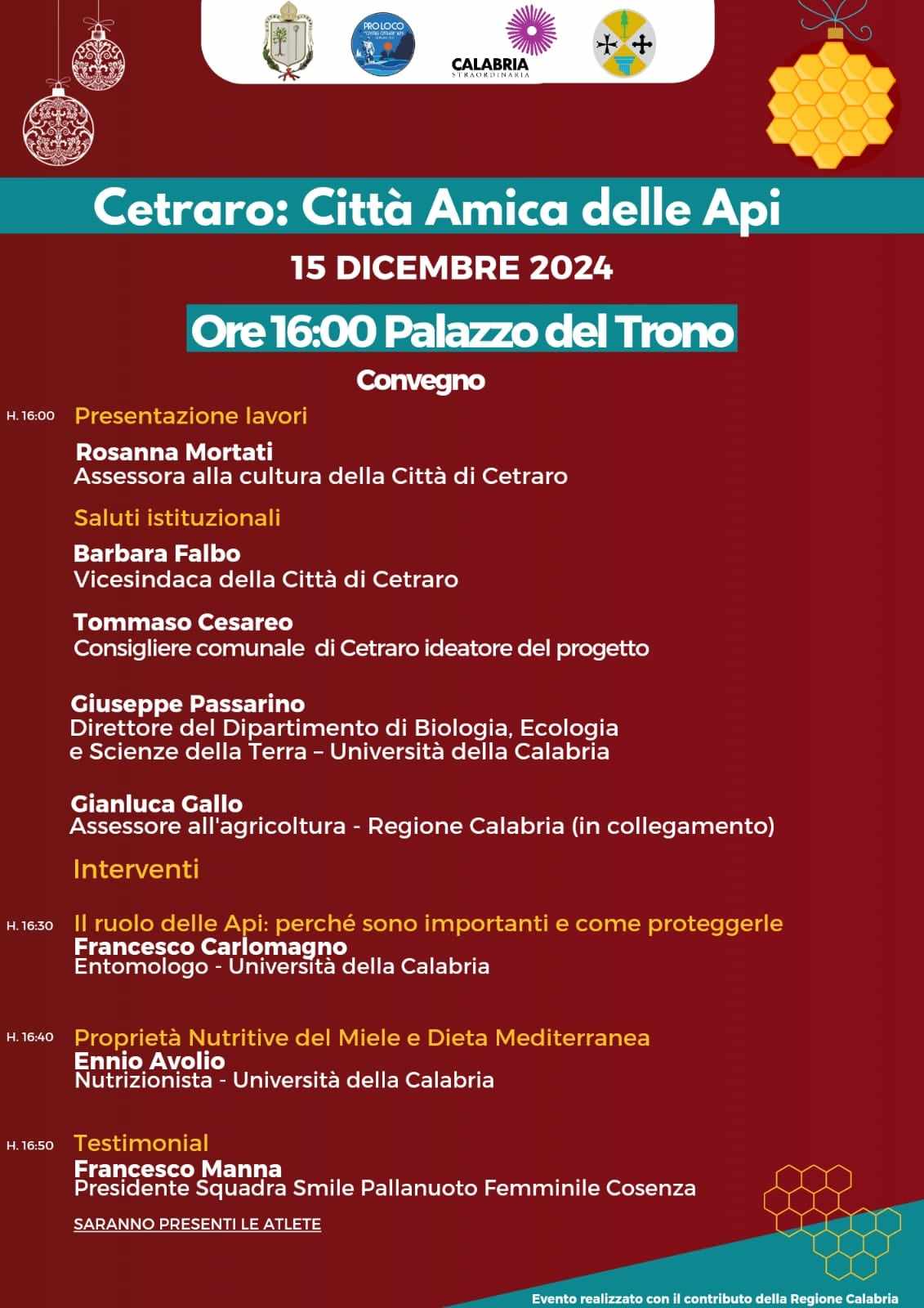 Un convegno, che prevede la presentazione dei lavori da parte dell’assessora Rosanna Mortati, i saluti della vicesindaca Barbara Falbo, dell’ideatore del progetto Tommaso Cesareo e dell’assessore all’Agricoltura della Regione Calabria Gianluca Gallo. Quindi, si entrerà in tema con il contributo del prof. Giuseppe Passarino, Direttore del Dipartimento di Biologia Ecologia e Scienze della Terra Università della Calabria, del dr. Francesco Carlomagno, Entomologo – UNICAL e del dr. Ennio Avolio, Nutrizionista – UNICAL.