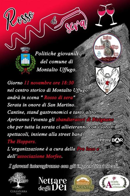Oggi 11 novembre dalle ore 18:30 si aprirà l’evento “Rosso di sera” organizzato dalla Pro loco di Montalto Uffugo, Associazione Morfeo e Le politiche giovanili del Comune di Montalto Uffugo