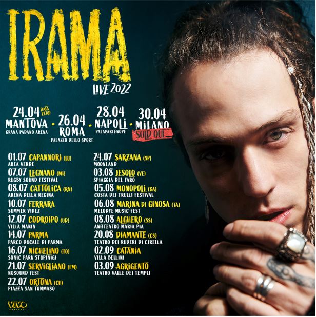 Prima di partire con le date estive, Irama terrà 4 concerti nelle prossime settimane: sarà a Mantova il 24 aprile, a Roma il 26, a Napoli il 28 e il 30 ad Assago (MI), appuntamento già sold out.
