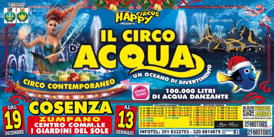 Uno show contemporaneo che promette un’esperienza indimenticabile! Con oltre 100.000 litri di acqua danzante e spettacoli mozzafiato, il Circo d’Acqua è pronto a stupire adulti e bambini. Una data, il 9 gennaio, sarà la giornata dedicata alla solidarietà: parte dell’incasso dello spettacolo infatti sarà devoluta a sostegno delle tre associazioni indicate nella locandina.