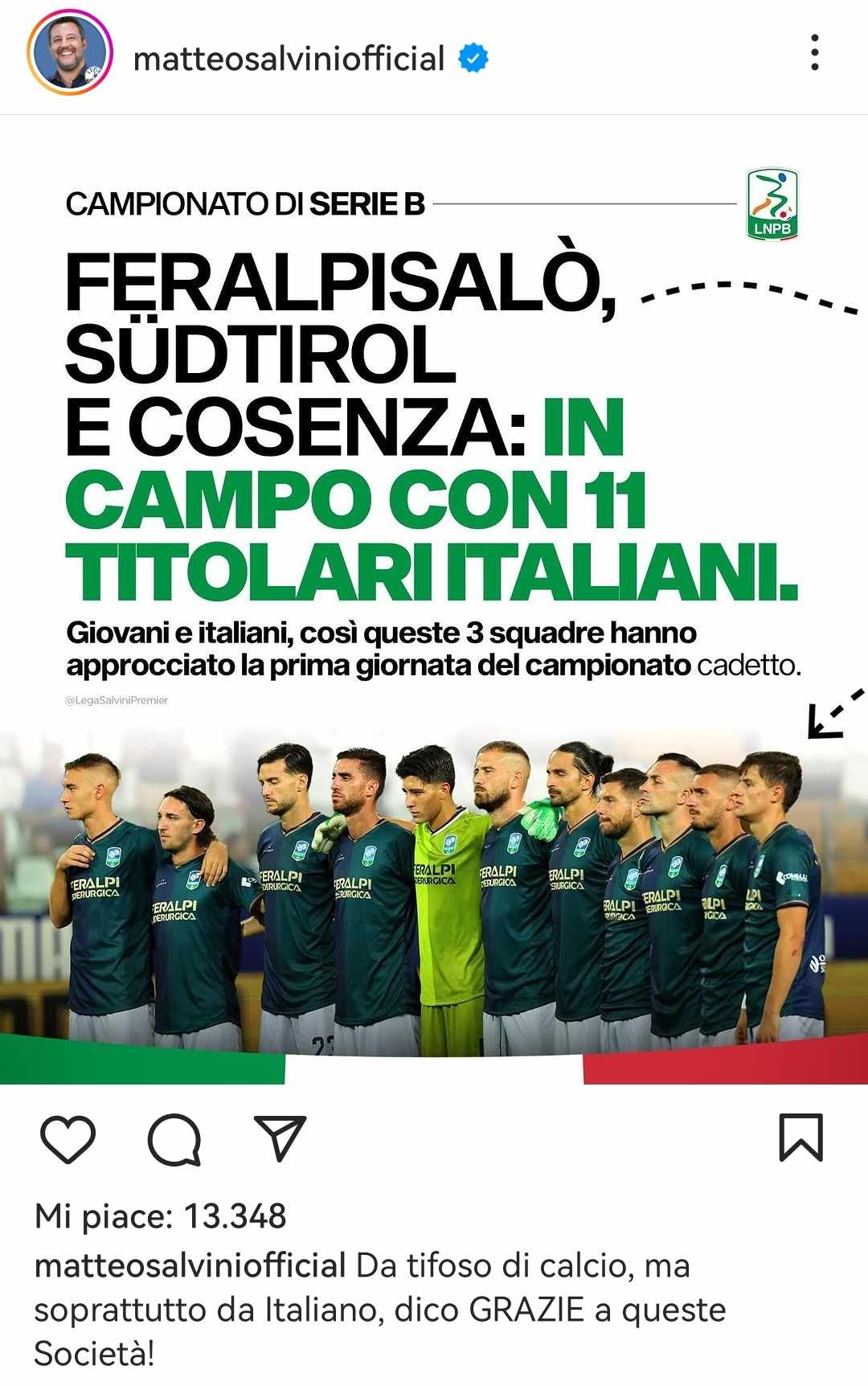 Lo scrive il vicepresidente del Consiglio, Matteo Salvini, su Instagram, commentando una foto che elenca 3 squadre di calcio di serie B (Feralpisalò, Sudtirol e Cosenza) che hanno messo in campo 11 giocatori italiani nella prima giornata del campionato.