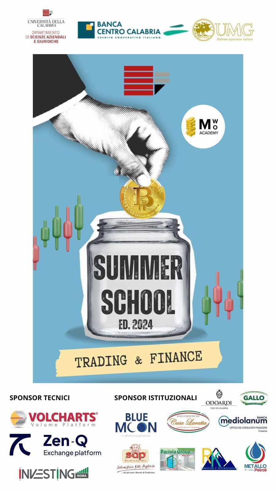 La Summer School offre un programma intensivo con due sessioni giornaliere (mattina e pomeriggio), dal lunedì al venerdì. Ogni giornata vedrà la partecipazione di relatori di spicco del settore, offrendo un mix equilibrato di teoria e pratica attraverso giochi e simulazioni in aula. L’evento, promosso dal Prof. Fabio Piluso, gode del patrocinio dell’Unical e dell’Università Magna Grecia di Catanzaro, ed è supportato da aziende leader nel trading come Volcharts, Sos Trader, Investing e dalla Bcc Centro Calabria.