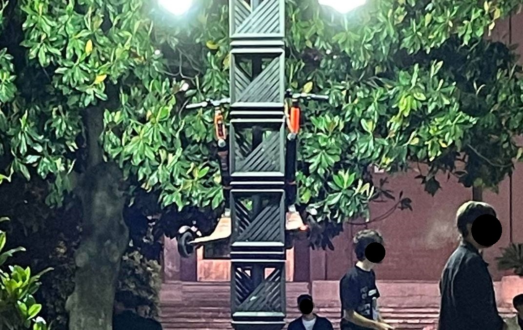 “Guardate questi due campioni. Uno sale sull’obelisco presente su piazza Santa Teresa e l’altro gli porge i monopattini a noleggio, per appenderli in alto sullo stesso.