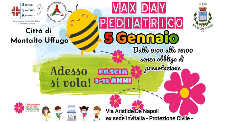“Il Vax Day Pediatrico a Montalto Uffugo è un’iniziativa promossa dalla Protezione Civile Locale e dall’Asp di Cosenza sarà diretta ai bimbi fascia d’età 5/11 anni che ancora non hanno svolto la prima dose anti-covid.”